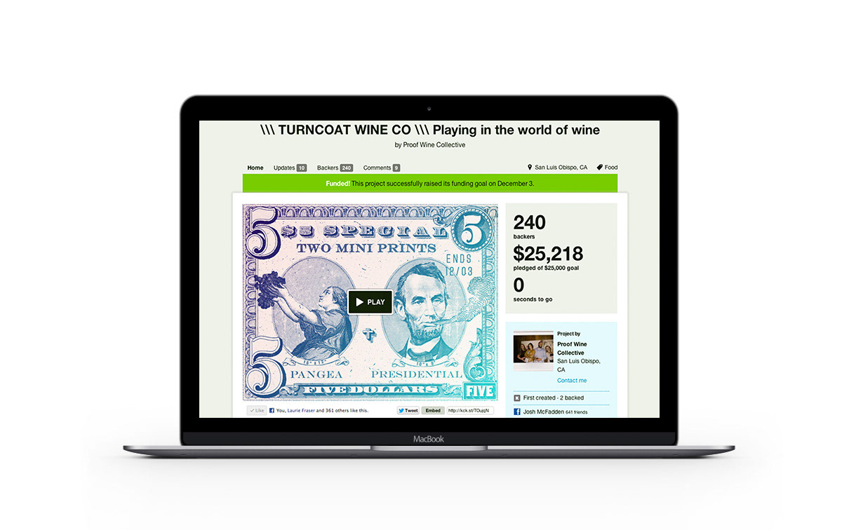 Client: Turncoat Wine Company Art Direction: Josh McFadden Designed at Proof Wine Collective. Kickstarter and Facebook campaign/collateral highlighting special promotions on two art prints "Wine Pangea" and "Presidential Drugs of Choice".